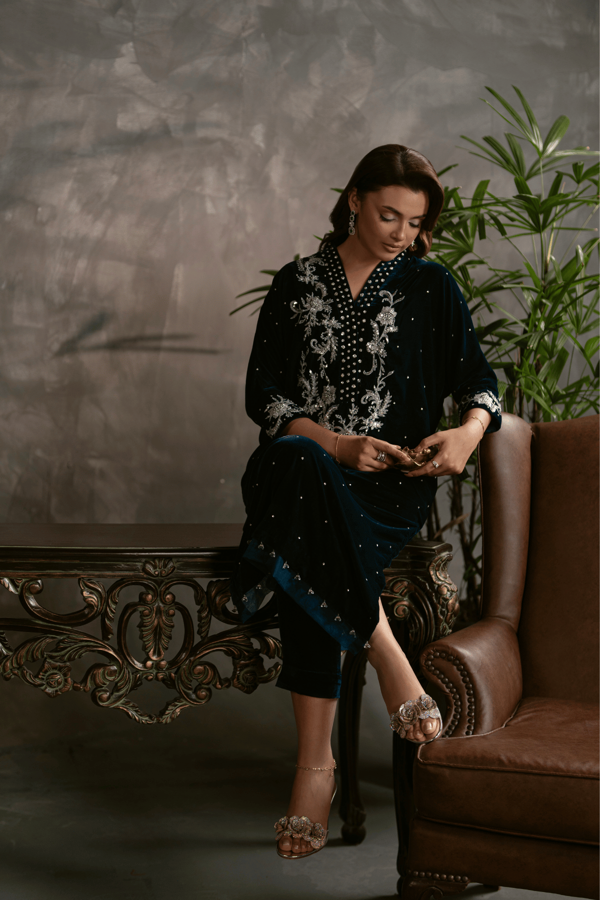 A stunning deep teal 2-piece ensemble featuring a flowy kaftan-style long shirt paired with pants. Handcrafted embroidery graces the front and sleeves, while the shirt and placket shimmer with hand-embellished crystals, meticulously applied through traditional adda technique — radiating timeless elegance with a modern twist.