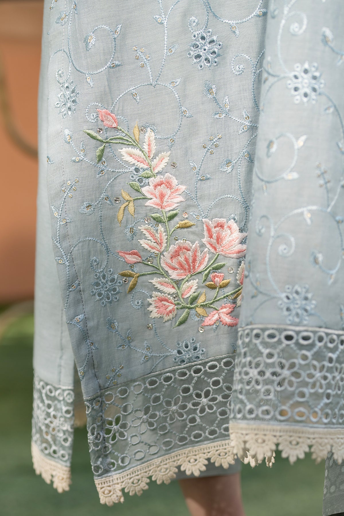 This exquisite Banarsi lawn two-piece features a formal long shirt with paired with silk straight pants. The long shirt is adorned with delicate pink and cream embroidery, intricate lace accents on the sleeves and hem, finished with a stunning 3D floral placket.