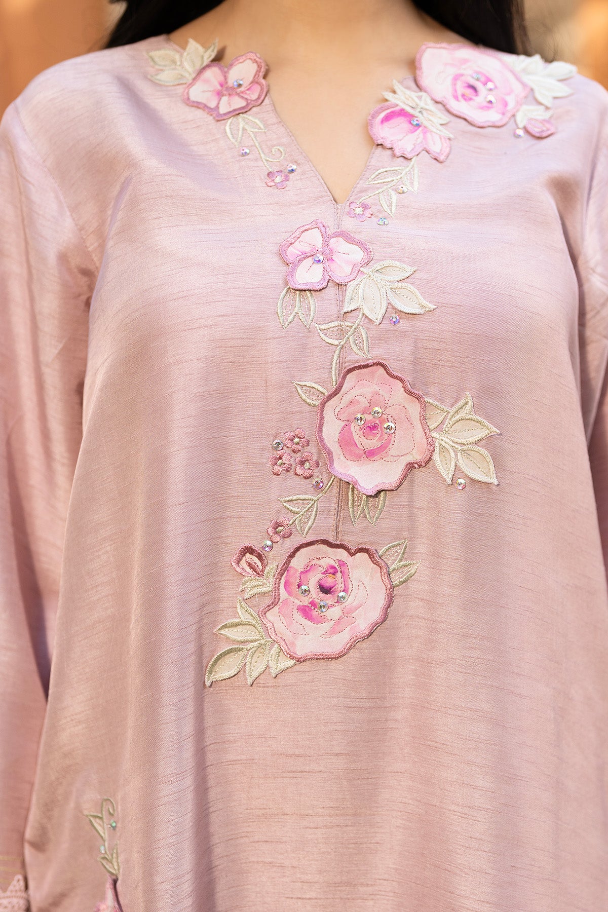 This silk co-ord set features a chic short kurta with a delicate scalloped hemline, intricate white floral appliqués at the hem corners, embellished with sparkling diamantés. Finished with dainty embroidery along the pearl-buttoned placket and paired with matching tailored culottes.
