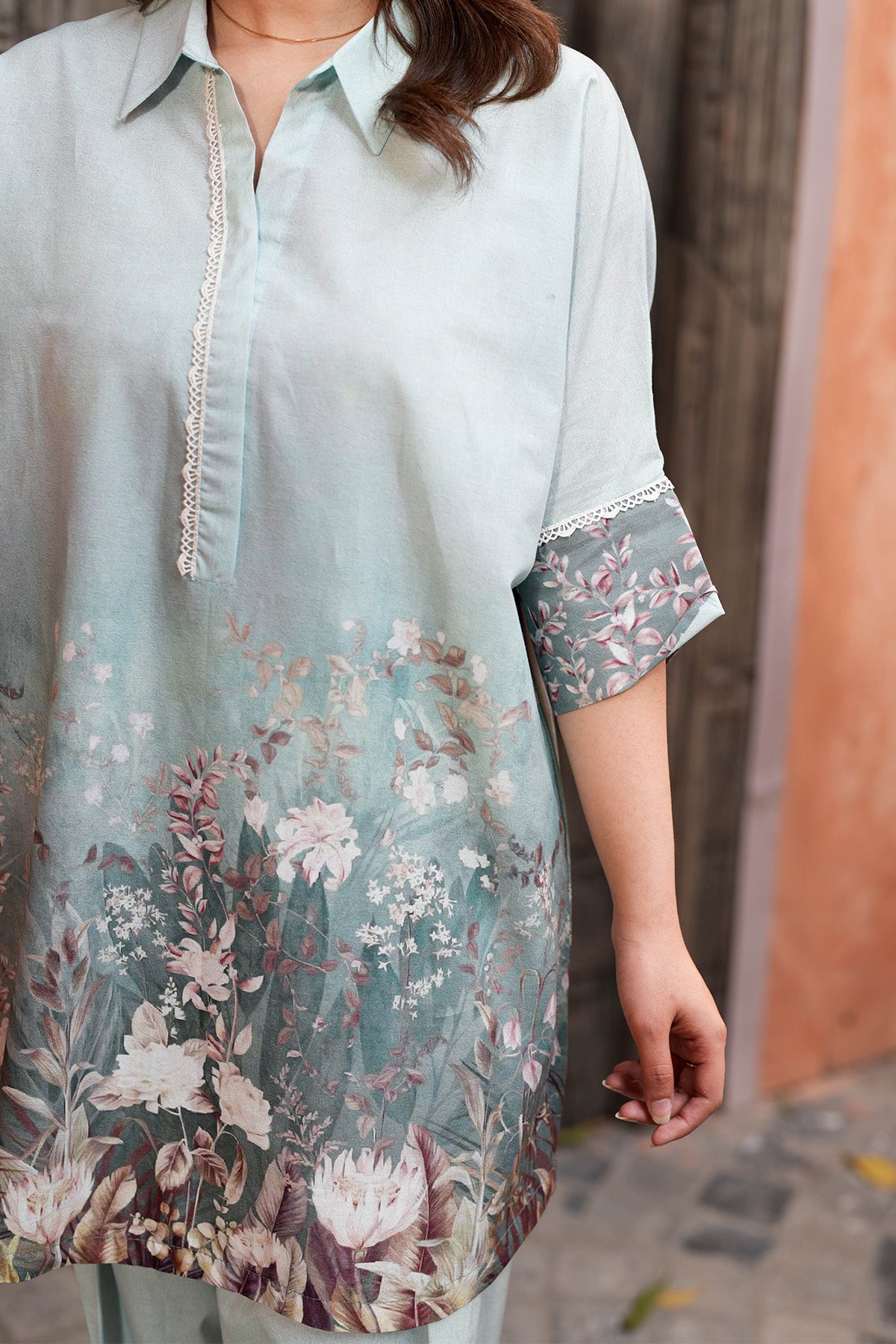 This misty blue pure lawn co-ord set features a short-length collared shirt and matching tulip-style trousers, showcasing an intricate wild-flower digital print along the hemline in earthy tones. The design is complemented by cuffed sleeves with contrasting print details and a clean, laced placket, offering a chic and effortless daytime look.